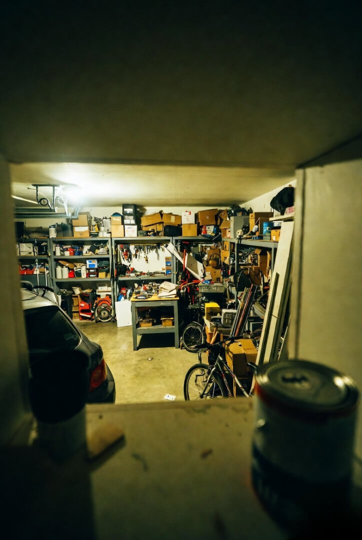 Legs up wall in messy garage, mismatched socks